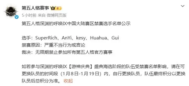 在线娱乐-第五人格五名选手被永久禁赛,原因包括:谈未成年、发不雅照等